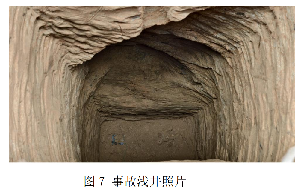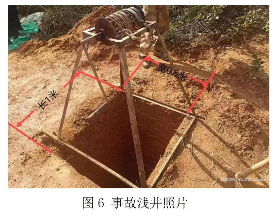 经现场勘验:事故发生当天天气为晴,但前几日有持续降雨情况。事故发生地的勘探浅井作业现场,浅井井口西北向至东南向长1米,东北向至西南向宽0.8米,浅井内无支护措施,浅井四周地形较高,未采取有效的截排水措施,浅井东北侧间距约1米处有钻孔。浅井外有井架1台、锄头1把、铁锹1把、撮箕2把等其他杂物,未见安全绳、安全帽等防护用品,未见气体检测设备。现场人员描述:浅井深约8米,坍塌点距离井口约4米,井底遗留锄头1把、撮箕1把、安全帽1顶。邹某某被埋时头戴安全帽,未系安全绳。